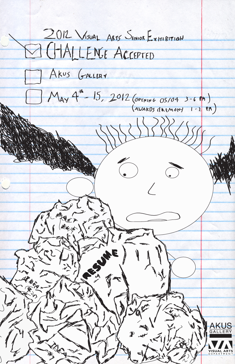 For the 2012 senior exhibition at Eastern Connecticut State University, one of my classes designed a promotional postcard and poster to invite people to the exhibit. With a tagline of “Challenge Accepted”, I crafted what I consider to be one of my strongest works. The combination of hand drawn and rendered graphics make this a favorite of mine and the use of irony, featuring an overly stressed college student (because face it, who hasn’t been there before?) make it a sort of unexpected expression of a “confident” artist at work.