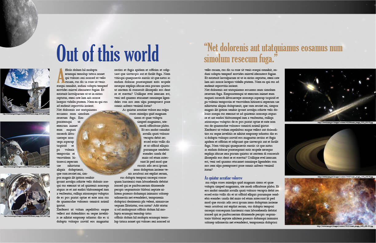 This is an inside page layout for the aforementioned travel magazine. I really enjoyed working with Indesign, using text wraps and column alignment to make a layout which type could flow through freely (this is all place-holder text with the exception of the headers) and feature photos on the side bars.